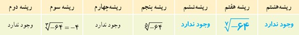ب ریشه های زوج 64 - وجود ندارند؛ زیرا عددی وجود ندارد که به توان …… برسد و مساوی 64 - شود.