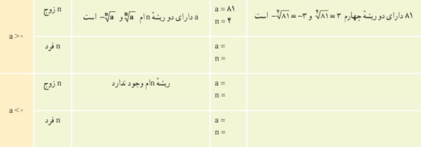 ت اگر a یک عدد منفی و \(n \in N\) باشد، دربارهٔ ریشه nام a چه می توان گفت؟