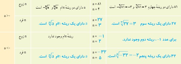 برای هر عدد مثبت a ، اگر n فرد باشد، دارای یک ریشه و اگر n زوج باشد، دارای دو ریشه که با هم قرینه اند، است.