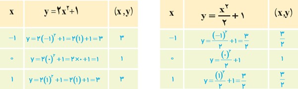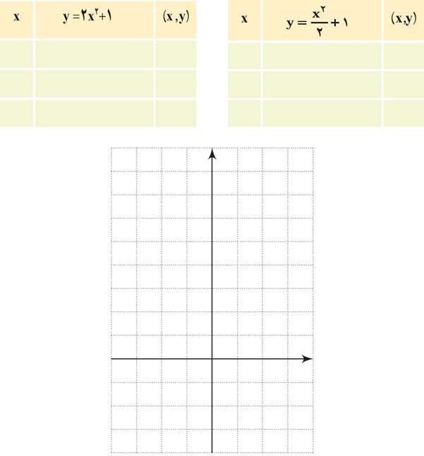 الف مختصات رأس و دو نقطه دیگر از این دو سهمی را در جدول زیر مشخص کنید و سپس نمودار هر دو سهمی را در شکل مقابل رسم کنید و نشان دهید که مختصات رأس هر دو سهمی نقطۀ A(0,1) است.
