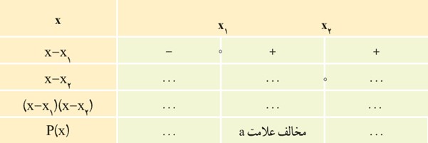 1 فرض کنید که معادلهٔ P(x)=0، دو ریشه متمایز x1 و x2 (x1<x2) داشته و به شکل \(P\left( x \right) = a\left( {x - {x_1}} \right)\left( {x - {x_2}} \right)\) تجزیه شده باشد. با تکمیل جدول زیر، علامت P(x) را برای xهای مختلف تعیین کنید.
