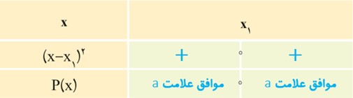 2 اگر معادلهٔ P(x)=0 ریشهٔ مضاعف برابر با x1 داشته باشد، می توانیم P(x) را به شکل\(P\left( x \right) = a{\left( {x - {x_1}} \right)^2}\) بنویسیم. با تکمیل جدول زیر، علامت P(x) را برای xهای مختلف تعیین کنید.