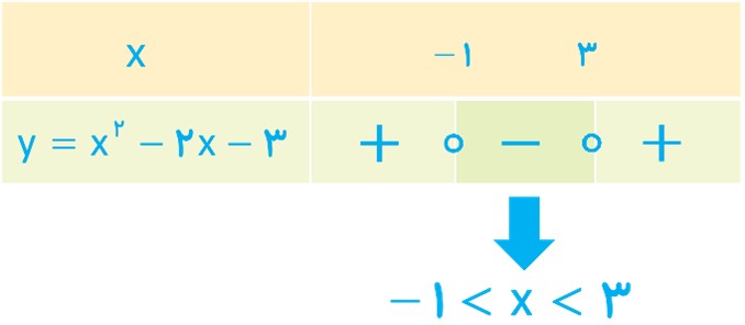 -1 < x < 3 مشخص شده است. همچنین به کمک جدول تعیین علامت نیز به همین جواب رسیدیم.