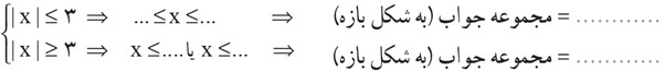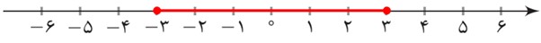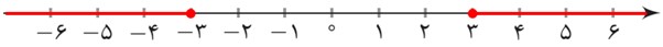 2 نامعادلۀ \(\left| x \right| \ge 3\) را درنظر بگیرید. مجموعه جواب این نامعادله، شامل اعداد حقیقی x است که فاصلهٔ آنها از مبدأ بزرگ تر یا مساوی ٣ باشند، این اعداد را روی محور زیر نشان دهید.