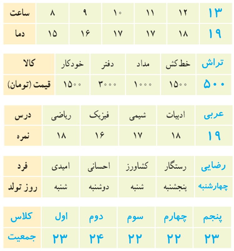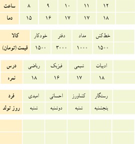 در جدول های زیر مثال های بالا و مواردی دیگر به کمک جدول ارائه شده اند. جاهای خالی را پر کنید. جدول آخر را به سلیقهٔ خودتان تکمیل کنید.