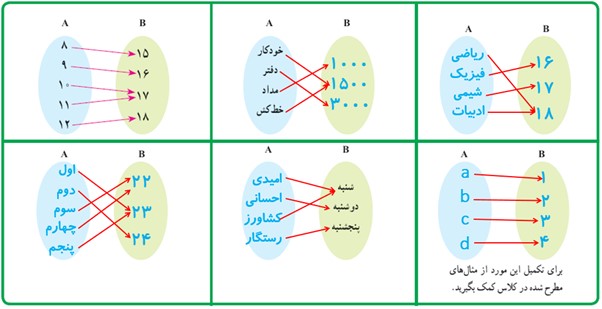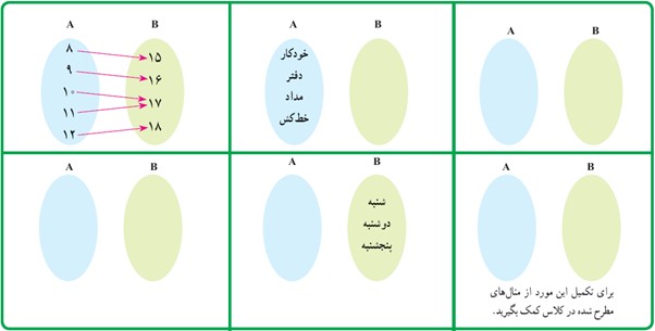 جدول های فعالیت 1 را می توان به کمک مجموعه ها و پیکان هایی که اعضای آنها را به هم مربوط می کنند، مشخص کرد. به این شیوهٔ نمایش، نمودارهای پیکانی می گوییم. یک نمونه کامل شده است. بقیه را شما کامل کنید.