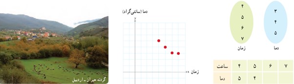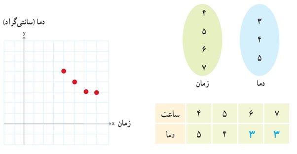 رابطهٔ بین زمان و دما را به صورت نمودار پیکانی نمایش دهید و معلوم کنید که آیا این رابطه یک تابع است؟ جدول را هم کامل کنید.
