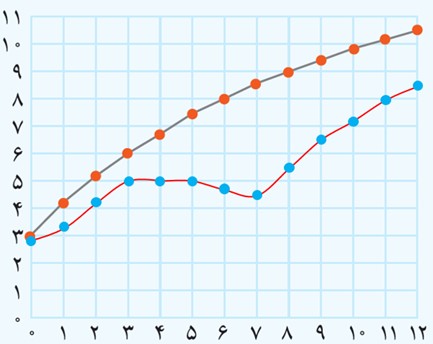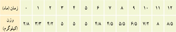پ اعداد داده شده در جدول را روی شکل (1) مشخص کنید. نقاط به دست آمده را به یکدیگر وصل کنید تا نمودار جدیدی به دست آید. با مقایسهٔ این نمودار با نمودار اصلی، رشد کودک از نظر وزن را در طی یک سال بررسی کنید.
