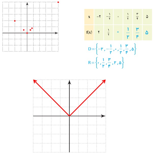 جدول زیر تابعی را نشان می دهد که اعداد داده شده را به قدرمطلق آن نظیر می کند. جاهای خالی را پر و نمودار تابع را رسم کنید. دامنه و برد این تابع را معلوم کنید.
