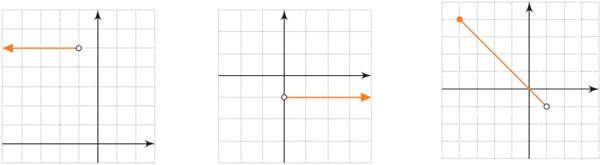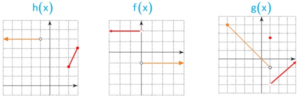 \(\begin{array}{l}f\left( x \right) = \left\{ \begin{array}{l} - 1\;\;\;\;\;x > 0\\2\;\;\;\;\;\;x < 0\end{array} \right.\\\\g\left( x \right) = \left\{ \begin{array}{l}x - 4\;\;\;\;\;x > 1\\\\\frac{5}{2}\;\;\;\;\;\;\;\;\;x = 1\\\\ - x\;\;\;\;\; - 4 \le x < 1\end{array} \right.\\\\h\left( x \right) = \left\{ \begin{array}{l}2x\;\;\;\;2 \le x \le 3\\5\;\;\;\;\;\;\;x < - 1\end{array} \right.\end{array}\)