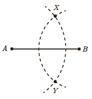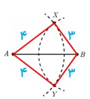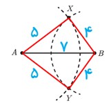 6 نقاط A و B را به فاصلهٔ ٥ سانتی متر از هم درنظر بگیرید. به مرکز A و به شعاع ٤ سانتی متر یک کمان رسم کنید و سپس به مرکز B و به شعاع ٣ سانتی متر کمانی دیگر رسم کنید تا دو کمان یکدیگر را در نقاطی مانند X و Y قطع کند.