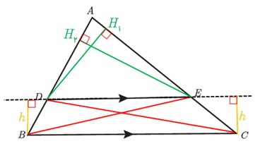 \(\left. {\begin{array}{*{20}{l}}{{S_{DEC}} = \frac{1}{2}h \cdot DE}\\{{S_{DEB}} = \frac{1}{2}h \cdot DE}\end{array}} \right\} \Rightarrow {S_{DEC}} = {S_{DEB}}\)