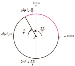 نسبت های مثلثاتی زاویهٔ \(\frac{{2\pi }}{3}\)  رادیان را به دست آورید.