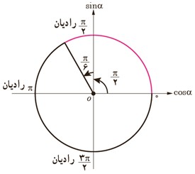 روش دوم - اختلاف دو زاویهٔ \(\frac{{2\pi }}{3}\)  رادیان و \(\frac{{\pi }}{6}\)  رادیان برابر با \(\frac{{\pi }}{2}\)  رادیان است؛ یعنی \(\frac{{2\pi }}{3} = \frac{\pi }{2} + \frac{\pi }{6}\) . بنابراین با توجه به علامت نسبت های مثلثاتی در ربع دوم: