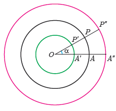 \(\begin{array}{l}\frac{{\mathop {PA}\limits^\frown }}{{OP}} = \frac{{\frac{\pi }{3}}}{2} = \frac{\pi }{6}\\\\\frac{{\mathop {P'A'}\limits^\frown }}{{OP'}} = \frac{{\frac{\pi }{6}}}{1} = \frac{\pi }{6}\\\\\frac{{\mathop {P''A''}\limits^\frown }}{{OP''}} = \frac{{\frac{\pi }{2}}}{3} = \frac{\pi }{6}\end{array}\)