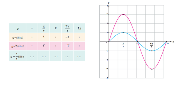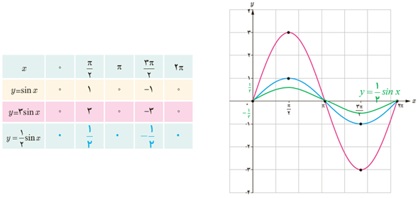 2 با مقایسهٔ نمودارهای بالا، نمودارهای توابع y=3sinx و \(y = \frac{1}{2}\sin x\) چه تفاوتی با نمودار تابع y=sinx دارند؟