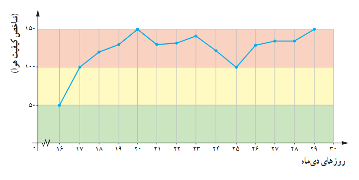 کیفیت هوا (AQI)، کیفیت هوای یک منطقه، یکی از وضعیت های پاک، سالم، نا سالم برای گروه های حساس، نا سالم، بسیار نا سالم و خطرناک می باشد. نمودار زیر، میانگین شاخص کیفیت هوا در 15 روز پایانی دی ماه سال 1395 در شهر تهران را نشان می دهد.