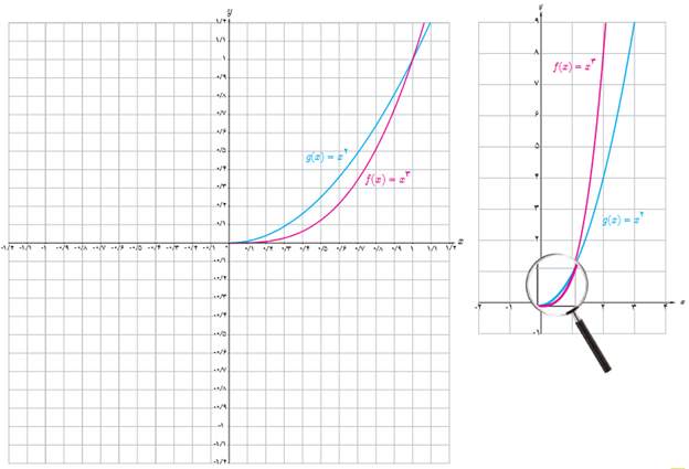 با توجه به نمودار توابع \(f\left( x \right) = {x^3}\) و \(g\left( x \right) = {x^2}\) که برای اعداد نامنفی رسم شده اند: