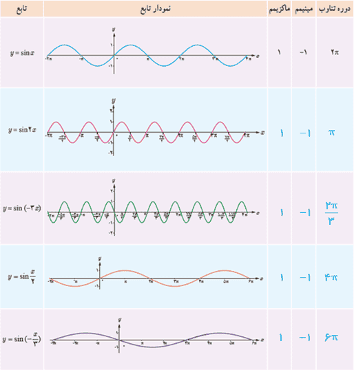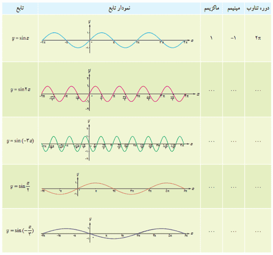 1 با دقت در نمودار هر یک از توابع داده شدهٔ زیر، دورهٔ تناوب و مقادیر ماکزیمم و مینیمم هر یک را تشخیص دهید. در ادامه می خواهیم با بررسی نمودارهای داده شده، تأثیر ضریب b در تابع y=sinbx را بر دورهٔ تناوب و مقادیر ماکزیمم و مینیمم این تابع بررسی کنیم.