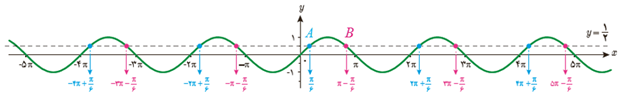 3 طول تعدادی از نقاط تقاطع دو نمودار \(y = \frac{1}{2}\) و y=sinx را که در شکل فوق مشخص شده اند، در معادله \(\sin x = \frac{1}{2}\) جایگذاری کنید. آیا در معادله صدق می کنند؟ چه نتیجه ای می گیرید؟