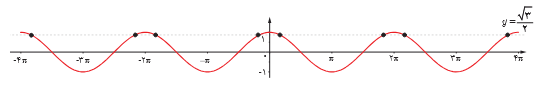نمودار تابع y=cosx و خط \(y = \frac{{\sqrt 3 }}{2}\) در زیر رسم شده اند. مشابه فعالیت قبل به سؤالات زیر پاسخ دهید تا جواب های معادله \(\cos x = \frac{{\sqrt 3 }}{2}\) را بیابید.