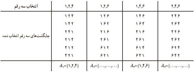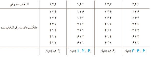 تعداد مجموعه های سه عضوی = \(\frac{{P\left( {4,3} \right)}}{{3!}} = \frac{{4!}}{{1!\, \times 3!}} = 4\)
