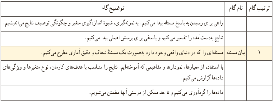 اکنون که چرخهٔ حل مسئله را می شناسیم، می توانیم در جدول زیر نام هر گام و ترتیب آن را مقابل توضیحاتش بنویسیم. (مشاهدهٔ نمونهٔ حل شده در سطر سوم می تواند به ما کمک کند.)