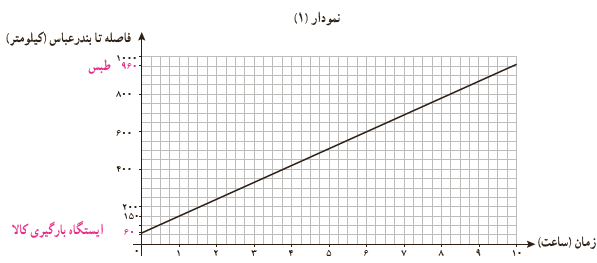 یک قطار باری از ایستگاهی در 60 کیلومتری بندرعباس بارگیری کرده است و مطابق نمودار مکان زمان زیر با سرعتی ثابت به سمت طبس حرکت می کند.