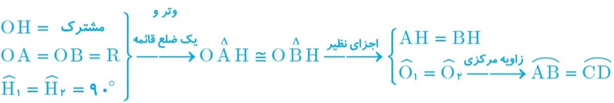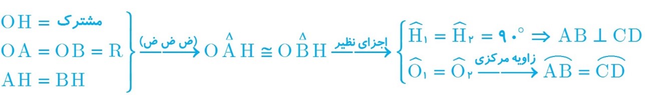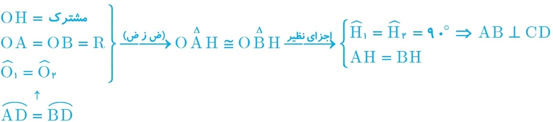 فرض: \(AH = BH\) حکم: \(\left. \begin{array}{l}\mathop {AD}\limits^\frown = \mathop {BD}\limits^\frown \\AB \bot CD\end{array} \right\}\)