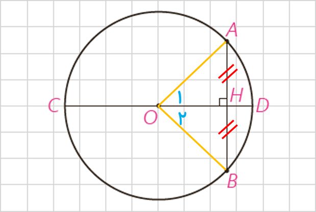 فرض: \(AB \bot CD\) حکم: \(\left. \begin{array}{l}\mathop {AD}\limits^\frown = \mathop {BD}\limits^\frown \\AH = BH\end{array} \right\}\)