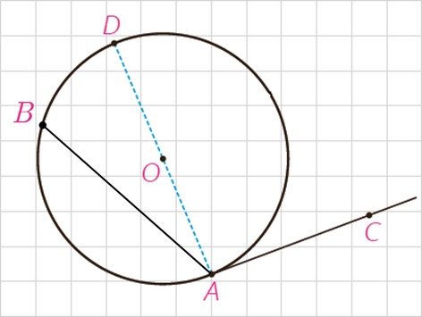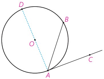 1 زاویهٔ ظلی\(\widehat {CAB}\) را درنظر بگیرید و قطری از دایره را رسم کنید که شامل نقطۀ A هست.