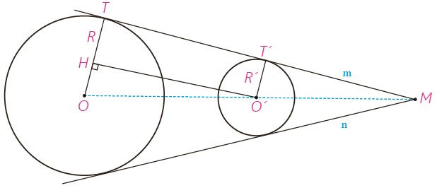 1 فرض کنیم مانند شکل خط m در نقاط T و T’ بر دو دایره مماس است و شعاع های OT و OT’ رسم شده است. فرض کنیم فاصله بین مرکزهای دو دایره برابر d باشد؛ از O’ خطی موازی خط m رسم می کنیم تا شعاع OT را در نقطه ای مانند H قطع کند.