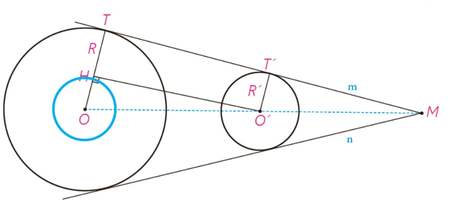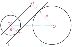 \(\begin{array}{l}O'\mathop O\limits^\Delta H:\quad \widehat H = {90^ \circ } \Rightarrow O'{H^2} = O{{O'}^2} - O{H^2}\\\\\mathop \Rightarrow \limits_{\scriptstyle OH = R + R'\atop\scriptstyle OO' = d}^{TT' = O'H} \;\;\;TT' = \sqrt {{d^2} - {{\left( {R + R'} \right)}^2}} \end{array}\)