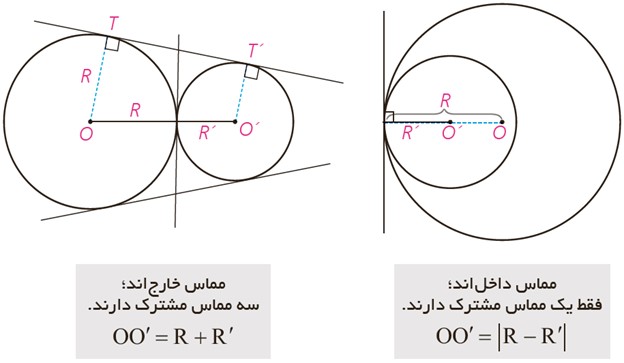 3 دو دایره مماس. دو دایره را که فقط یک نقطه مشترک داشته باشند، مماس می نامند. در این نقطه مشترک یک خط بر هر دو مماس است. اگر مرکزهای دو دایره در دوطرف این مماس باشند، آن دو دایره، مماس برونی است و اگر هر دو مرکز در یک طرف این مماس باشند، آنها را مماس درونی می نامند.