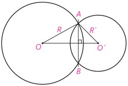\(OA=OB=R\) و \(O’A=O’B=R’ \). بنابر خاصیت عمودمنصف نقاط O و O’ روی عمود منصف AB قرار دارد و چون عمود منصف هر پاره خط یکتا است، در نتیجه پاره خط OO’ عمود منصف وتر مشترک AB است.