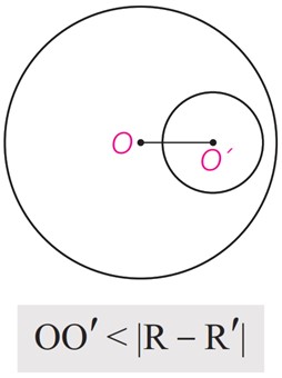 5 دو دایره متداخل. دو دایره را که تمام نقاط یکی درون دیگری باشد، متداخل می نامیم. دو دایره متداخل هیچ مماس مشترک ندارند و در آنها \(OO’ < |R – R’|\)
