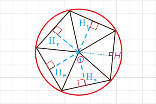 همچنین OH1 و OH2 و OH3 و OH4 همگی بر اضلاع عمود هستند. در نتیجه وقتی که یک دایره به شعاع OH رسم می کنیم شعاع ها بر اضلاع عمود هستند . پس اضلاع بر دایره در نقطه تماسشان عمودند یعنی دایره بر اضلاع چند ضلعی مماس است؛ در نتیجه بنا بر تعریف، دایره محاطی است.
