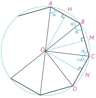 \(OA=OB=OC=OD=……\) و \(OH=ON=OM=….\) بنابراین، O از همه رأس ها به یک فاصله است؛ پس مرکز دایره ای است که از تمام رأس های n ضلعی منتظم می گذرد.