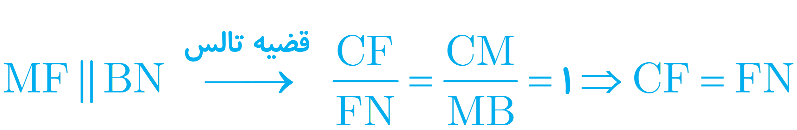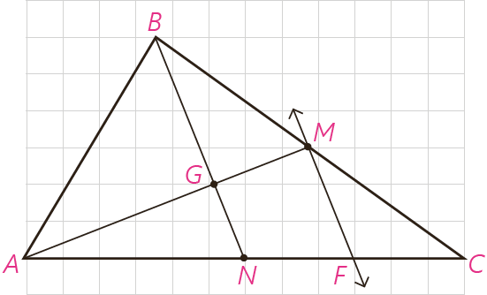 الف دو میانه AM و BN از \(\Delta ABC\) را رسم می کنیم. یکدیگر را در نقطهٔ O درون مثلث قطع می کنند. از M وسط ضلع BC خطی را موازی میانه BN رسم می کنیم تا ضلع AC را در F قطع کند. چرا F وسط NC است؟ N وسط ضلع AC است؛ بنابراین؛ AF = 3NF. چرا؟ در نتیجه، AM = 3GM. چرا؟