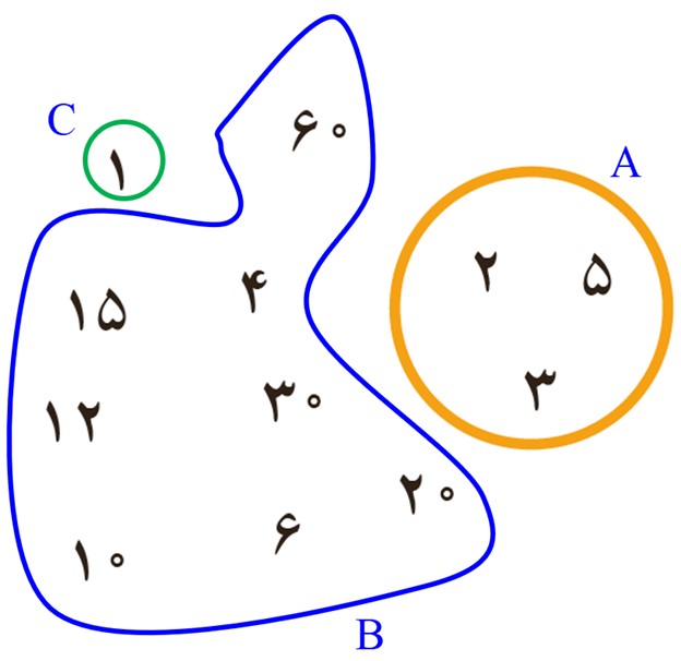 اگر شمارنده های طبیعی و اوّلِ عدد ٦٠ یعنی 2، 3 و 5 را در داخل دو آکلاد قرار دهیم و آن را با حروفی چون A یا B یا ... نام گذاری کنیم و بنویسیم A={2 , 3 , 5} ؛ در این صورت یک مجموعه تشکیل داده ایم و به هر یک از عددهای 2، 3 و 5 یک عضو مجموعۀ A می گوییم؛ پس مجموعهٔ A دارای 3 عضو است.