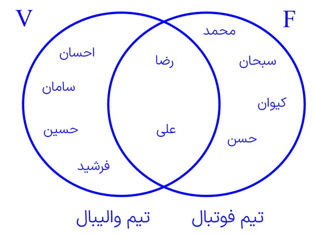 الف اگر مجموعهٔ دانش آموزان عضو تیم والیبال را با V و فوتبال را با F نشان دهیم، این مجموعه ها را با نمودار وِن نمایش دهید و سپس با عضو هایشان بنویسید.