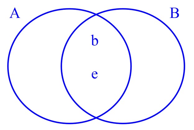 با توجه به اینکه داریم \(A \cap B = \left\{ {b\,,\,e} \right\}\) است، این دو عضو را در قسمت مشترک قرار می دهیم: