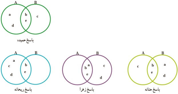 1 دو مجموعهٔ \(A \cup B = \left\{ {a\,,\,b\,,\,c\,,\,d\,,\,e} \right\}\) و \(A \cap B = \left\{ {b\,,\,e} \right\}\) را درنظر بگیرید. از دانش آموزان یک کلاس خواسته شده است که با توجه به این دو مجموعه، مجموعه های A و B را با نمودار وِن نمایش دهند. پاسخ چهار دانش آموزِ این کلاس را در زیر می بینید: