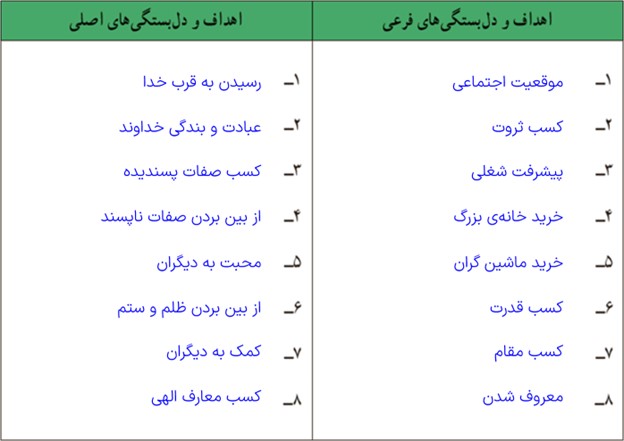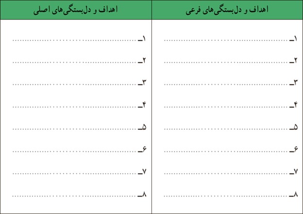 با توجه به اهدافی که دیگران برای زندگی خود انتخاب کرده اند، فهرستی از هدف ها تهیه کنید و با توجه به آنچه از فعالیت تدبّر آموخته اید، آنها را مطابق با جدول زیر تفکیک کنید.