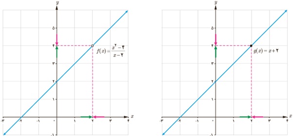 دو تابع g و f برابر نیستند (چرا؟)؛ ولی حد آن ها در x=2 برابر است.