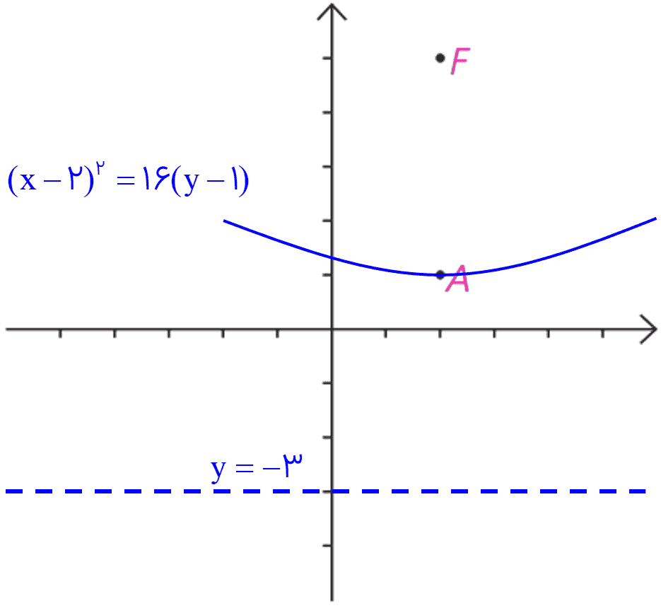 معادلهٔ سهمی به رأس A(2,1) و کانون F(2,5) را بیابید و معادلهٔ خط هادی آن را بنویسید.