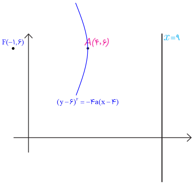مختصات کانون و همچنین معادله سهمی را به رأس A(4,6) و خط هادی x=9 بنویسید.