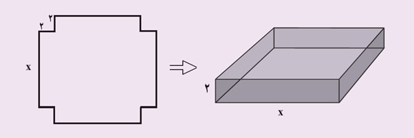 با یک دستگاه برش، یک صفحهٔ مقوایی به شکل مربع را برش می زنیم. سپس، چهار مربع کوچک در گوشه های آن را جدا می کنیم. بعد با تا زدن لبه ها، یک جعبه می سازیم. اگر مربع های جداشده به ضلع 2 سانتی متر باشند و بخواهیم حجم این جعبه، 200 سانتی متر مکعب باشد، طول اضلاع کاغذهایی را که باید برای این کار انتخاب شوند، به دست آورید.