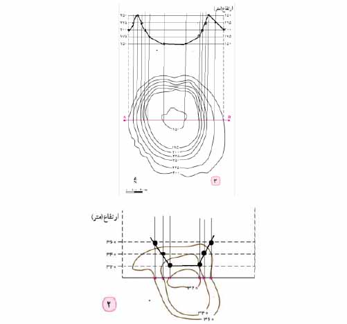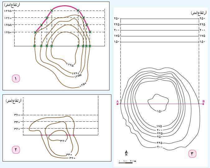 برای این که شکل پدیده ها و شیب آنها را تشخیص بدهیم، نیم رخ توپوگرافی رارسم می کنیم. به کمک دبیر و دقت در شکل 1، مراحل ترسیم نیم رخ را توضیح دهید.سپس با تمرین روی شکل های 2 و 3 ، نیم رخ توپوگرافی را رسم کنید.