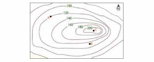 3) ارتفاع نقطه A ، 210 متر است زیرا اختلاف ارتفاع منحنی های میزان 20 متر است و نقطه A بعد از منحنی 200 متر قرار دارد و این نقطه در وسط قرار دارد.